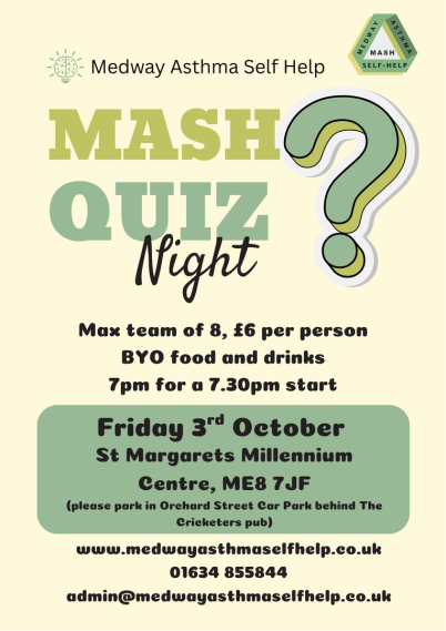 Limited tables available on a first come first serve basis. Our last quiz was very popular and was fully booked. Please contact MASH on 01634 855844 or admin@medwayasthmaselfhelp.co.uk to book your table. Alternatively, you can fill in the form at the bottom of this page.