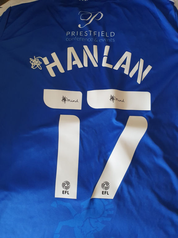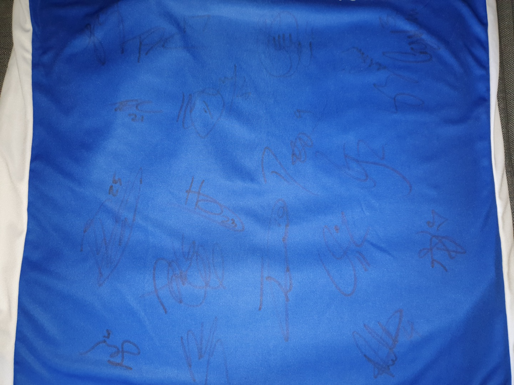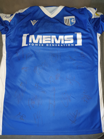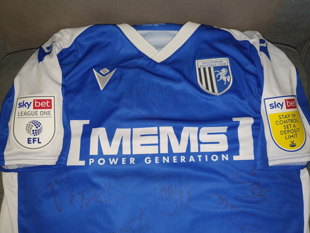 Generously donated by Gillingham FC, this home shirt for the 2020/21 season has been signed by all members of the playing sqaud. The shirt is blue with white trim.