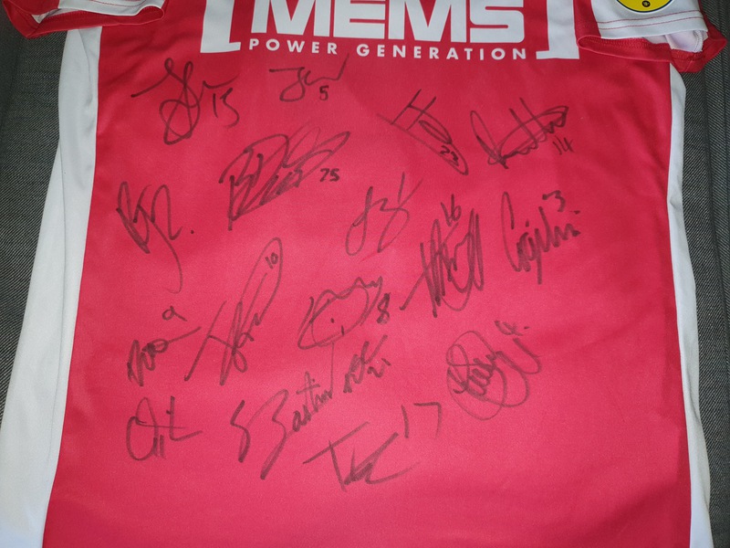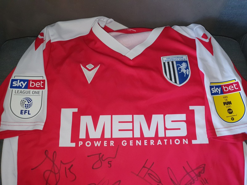 Generously donated by Gillingham FC, this away shirt for the 2020/21 season has been signed by all members of the playing sqaud. The shirt is red with white trim.